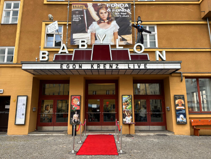 Über dem Eingang des Kinos prangt in schwarzen Lettern „Egon Krenz Live“ und noch darüber eine Plakatwerbung für Filme mit Jane Fonda. Das Motiv darauf ist aus dem Spielfilm von 1965 „Cat Bellou“. Jane Fonda mit dem Kopf in der Schlinge am Galgen. Ein Sinnbild für den Abendgast?
